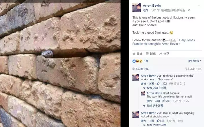 上載照片的貝文(Arron Bevin)說這是自己見過最能欺騙雙眼的照片,呼籲看出真相的網民轉發,但不要洩露照片隱藏的秘密。