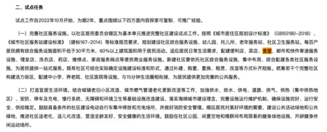 10月31日,住建部、民政部聯合發布《關於開展完整社區建設試點工作的通知》。文件中提到:試點社區為「適應居民日常生活需求,配建便利店、菜店、食堂、郵件和快件寄遞服務設施」,並要求各市選取3個-5個社區開展完整社區建設試點,自2022年10月開始,為期2年。
