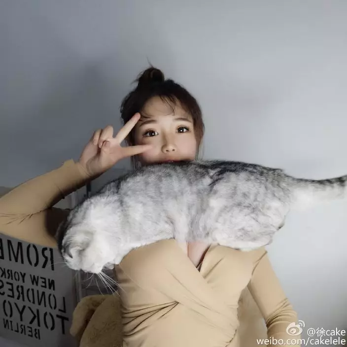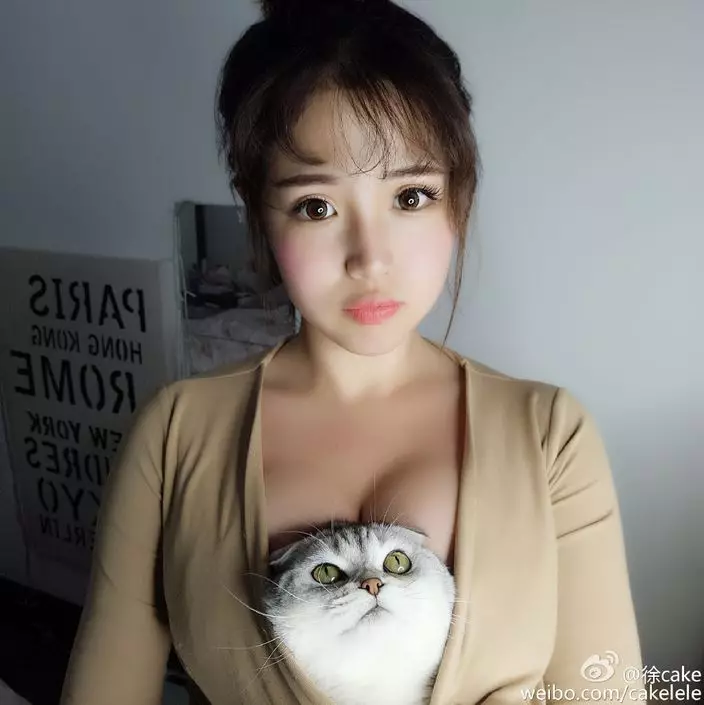 22歲網絡人氣女模「徐Cake」徐嘉樂微博有不少追隨粉絲,近日進行新挑戰,用自己豐滿而驕人的胸部竟然夾住了一隻肥貓:「A4腰已經Out,最新的是能趴喵! (我家寶寶快3歲了,好大一隻貓)。」