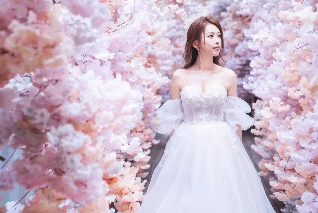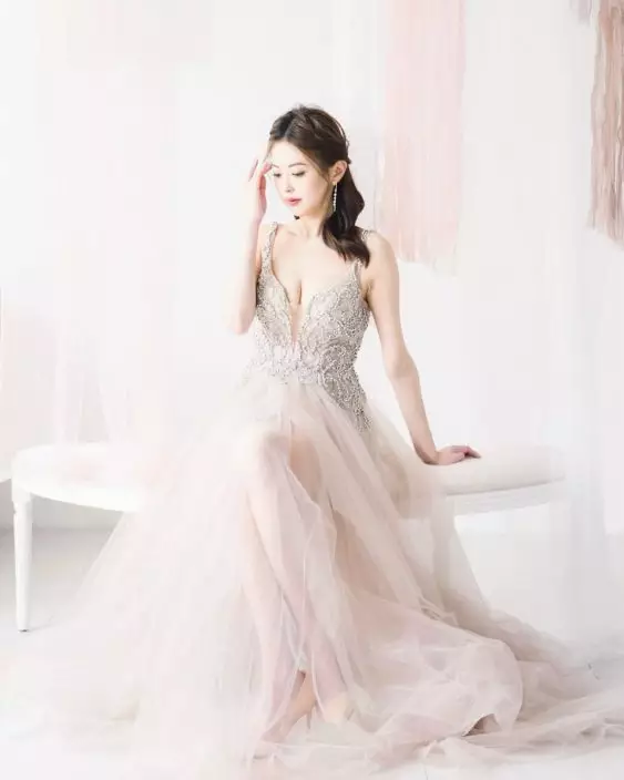 穿上低胸婚紗的她,毫不吝嗇地大騷事業線,更有白滑玉背照,盡顯好身材。