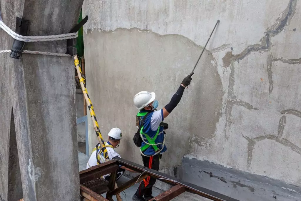 保育團隊勘察皇都戲院各處結構狀況,尤其天台部分,用上「敲鎚勘察」方式。
