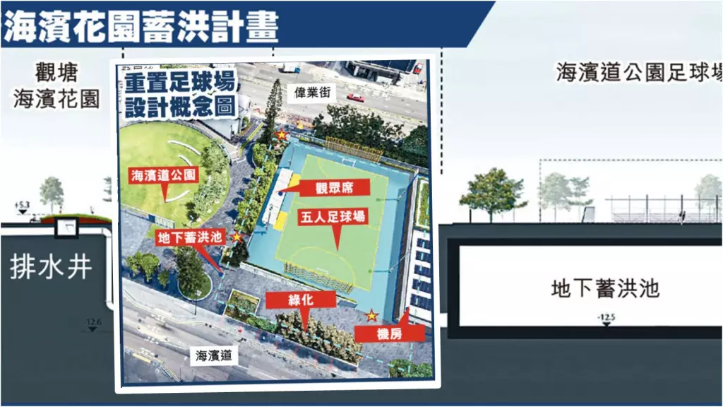 值得留意的是,渠務署會採用「一地多用」的理念,善用土地資源。當防洪工程完成後,將於地下蓄洪池之上蓋地面位置重置原有足球場設施。重置後的海濱道公園將提供一個五人足球場及觀眾席供市民使用。