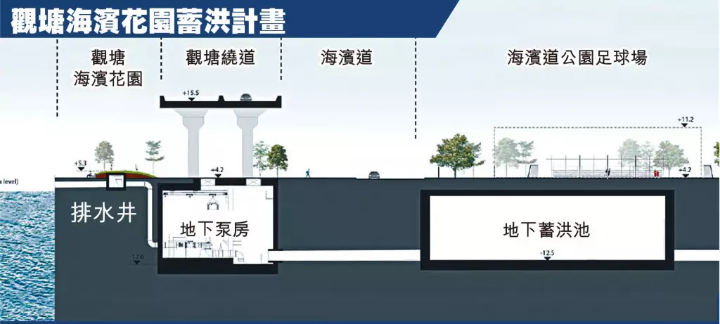 觀塘海濱花園蓄洪計畫的工程,主要包括興建一所容量約二萬二千五百立方米的地下雨水蓄洪池、地下泵房、機電設施及相關的雨水渠;於附近道路興建雨水渠;及進行附屬工程,包括重置五人足球場、觀眾席、休憩用地等相關設施。