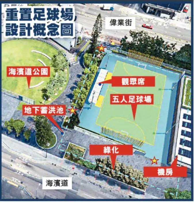 重置後的海濱道公園將提供一個五人足球場及觀眾席供市民使用。