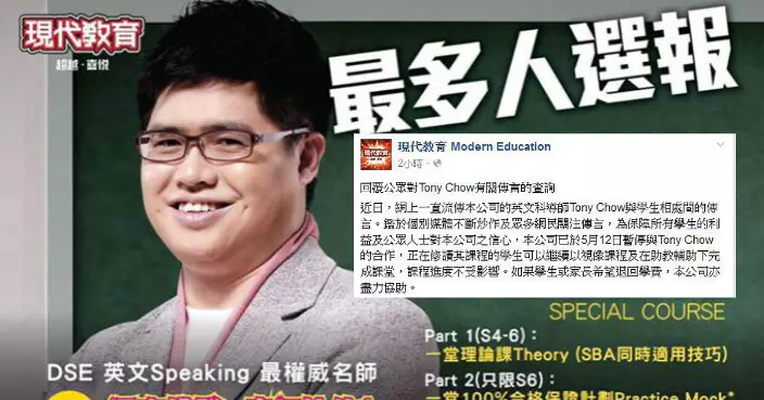 繼遵理學校通識科補習教師Oscar Ma早前因涉及師生戀風波而辭職,網上有數名男子表示,與現代教育導師Tony Chow相處時曾遭受對方有不恰當行為。現代教育今日在facebook官方專頁宣布,就傳聞已於5月12日暫停與Tony Chow合作。