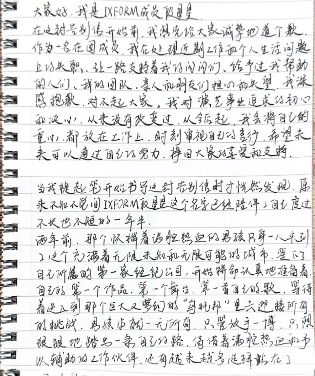 段星星與周揚青的戀情曝光後,段星星備受壓力,被粉絲批評他身為偶像卻談戀愛。近來團體「IXFORM」解散,每個團員都寫下告別信,段星星日前都貼出自己手寫的告別信,他先向粉絲們道歉表示:「作為一名在團成員,我在處理近期工作和個人生活問題上的失職,讓一直支持我的閃閃們失望,給予過我幫助的人們,我的團隊、親人和朋友們擔心和失望,我深感抱歉,對不起大家。」