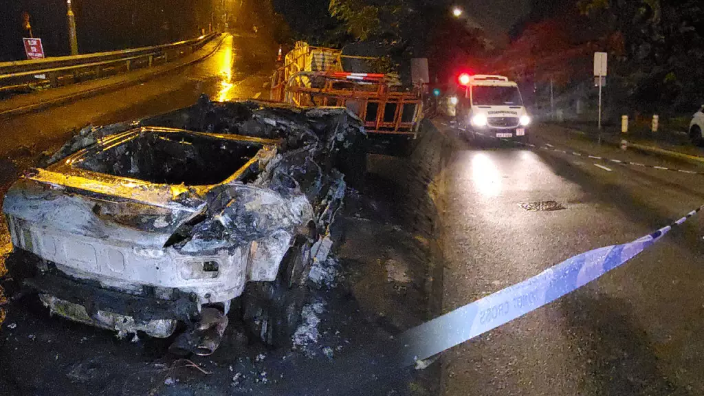 元朗青山公路屏山段灰沙圍一名正在倒垃圾的14歲少年,周一(7日)晚近10時被一輛私家車撞飛浴血,私家車其後往屯門方向不顧而去。至8日凌晨3時許,車禍現場3公里外的屯門虎地黃崗圍路路邊,一輛黑色奧迪私家車懷疑被人縱火焚毀。消息指警方經調查後,證實兩宗案件所涉為同一車輛,並拘捕私家車車主。另截至8日下午3時,少年仍然命危。