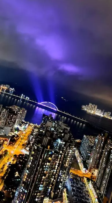 預計今年完工的將軍澳跨灣連接路工程已接近尾聲,8日晚有居民捕獲大橋疑似試行亮燈,十分興奮,可見居民日日望實大橋進展。照片所見,大橋射出紫色LED射燈,夜空頓時染成絢麗紫色,璀璨又有點浪漫。大橋早前亦曾開通讓巴士試行。