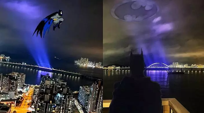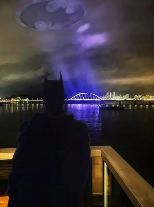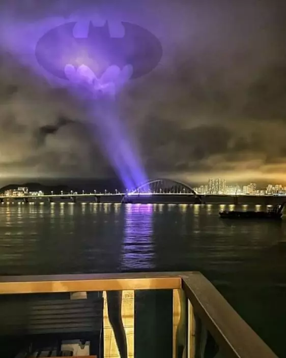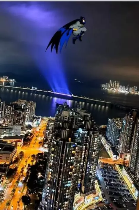 將軍澳跨灣大橋即將落成,大橋近日出現紫光射燈並射向天空,吸引網民紛紛改圖召喚蝙蝠俠。