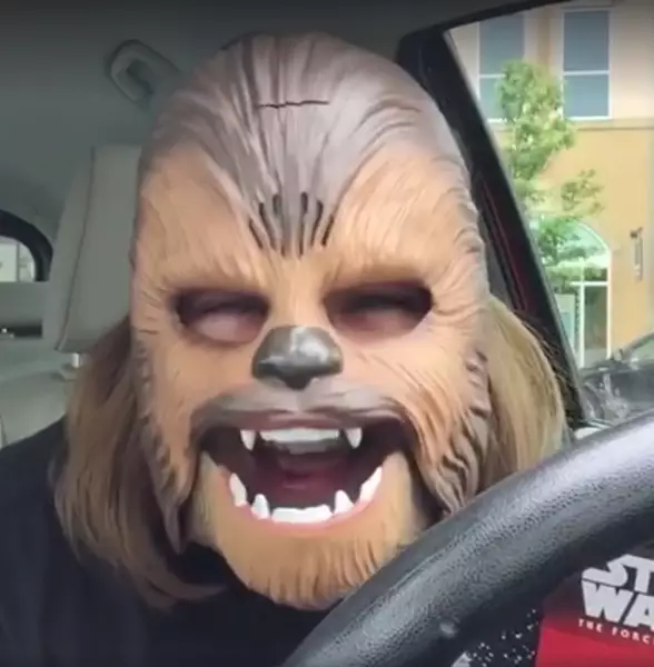 37歲佩恩(Candace Payne)來自達拉斯,她周四去購物,原本只是買運動服和給孩子買些東西,期間見到一個「Chewbacca」面具。作為星戰迷的她一併買了這個面具,購物完回到私家車上後,更忍不住在facebook直播試戴過程。