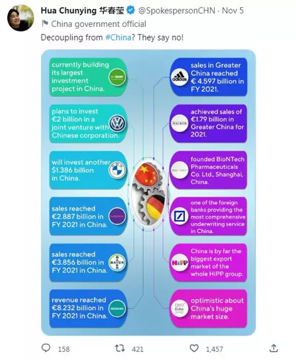 進博會開幕第一天,中國外交部部長助理、發言人華春瑩在社交媒體發了一張圖片,梳理了德企跟中國合作情況,並配上一條文字:「與中國脫鉤?他們說不!」帖文迅速引起熱議。