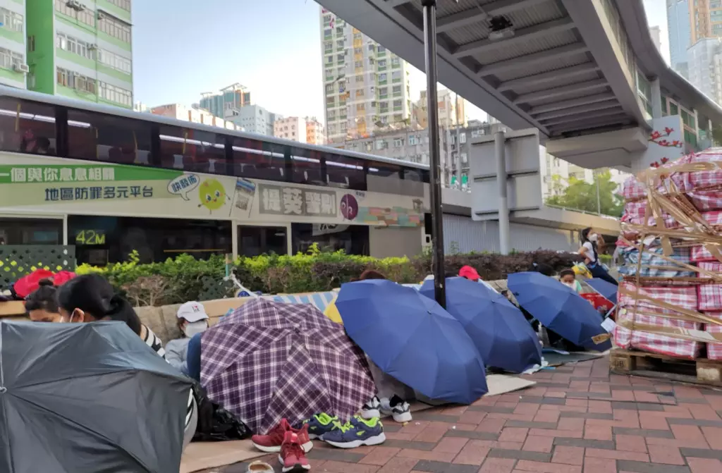荃灣路德圍近力生廣場對開,每逢假日聚集大量外傭在街頭野餐聚會,還會夾雜速遞公司收集大量外傭寄送貨物回鄉,造成至少一半街遭佔據,行人無法順暢行走,臨近聖誕等節日情況更見嚴重,為杜絕有關亂象,荃灣警區人員由上周六(12日)起一連兩日聯同食環署在區內先後進行兩次聯合行動,在路德圍一帶突擊巡視,打擊街道阻塞行為。