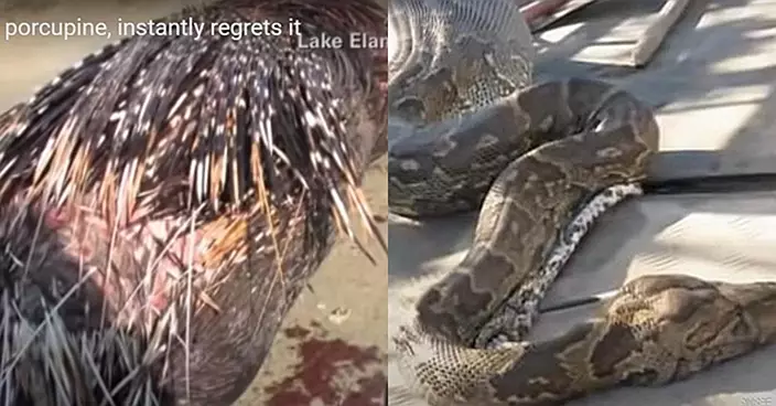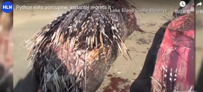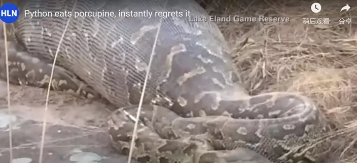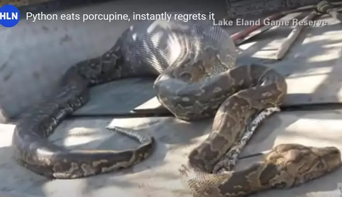 據外國媒體報道,南非的私人野生動物保護區Lake Eland Game Reserve,有一條長約3.9米的非洲岩蟒,在吞下重達13.8公斤的巨型豪豬後離奇死亡。從影片中可見,蟒蛇的肚子被撐得鼓鼓的,園區內的巡守員為了釐清牠的死因,剖開蟒蛇的肚子,在裡面發現一頭尚未消化的豪豬,豪豬的身體十分完整,身上的大部分的刺也都還在,但有一些刺穿了蟒蛇的消化道,導致其死亡。