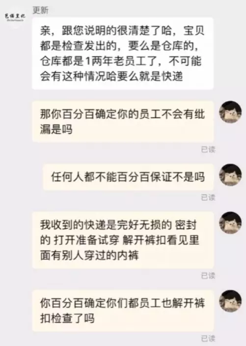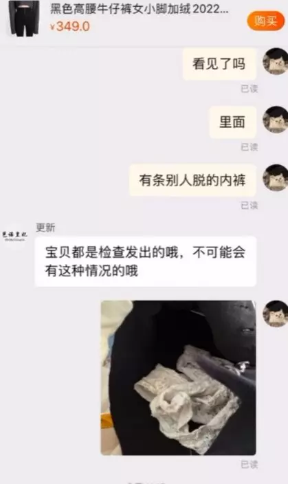 山東青島姓孟女子15日稱,自己網購了一條價值300多元人民幣(約333元港幣)的牛仔褲,收到快遞後準備試穿一下,解開褲扣後,褲子裡竟然還有條內褲。孟女指,第一反應是別人退換貨之後沒有檢查仔細就發出了,立刻聯絡客戶服務員,但對方態度很強硬,先要求她確認快遞包裝是否完整。當孟女表示快遞並未破損,質疑涉事店鋪檢查不認真後,客服多次強調:「產品都是經過檢查才會發出,倉庫裡是一到兩年的老員工,100%不可能有這種錯誤。」