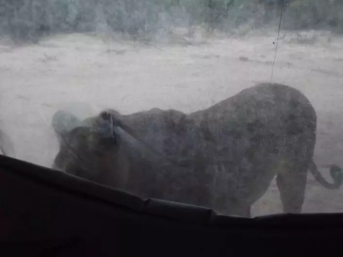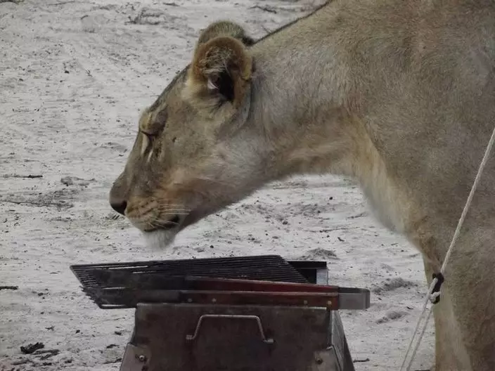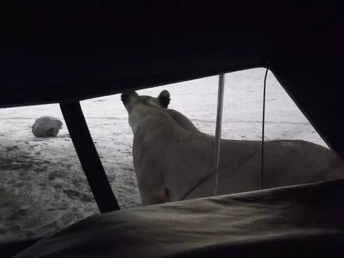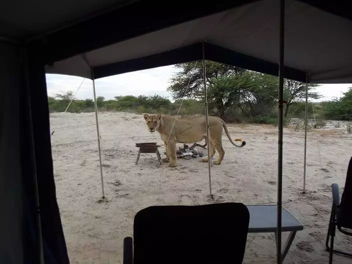 來自南非的盧貝(Francie Francisca Lubbe)與伴侶在馬布阿塞胡貝禁獵區(Mabuasehube Game Reserve)露營,一覺睡醒就發現兩隻「不速之客」與自己帳蓬一網之隔不斷舔,兩人保持鎮定輕聲說話,待獅子離開後才鬆一口氣。