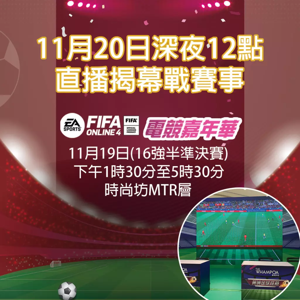 直播地點設於商場內的時尚坊。頭炮活動是LED直播揭幕戰卡塔爾VS 厄瓜多爾。而為讓球迷熱身,商場舉行「FIFA Online 4 電競嘉年華」,64位電競好手爭奪香港區「冠軍」,期間著名足球評述員Keyman(馬啟仁)在場與參賽選手交流打機和睇波心得。