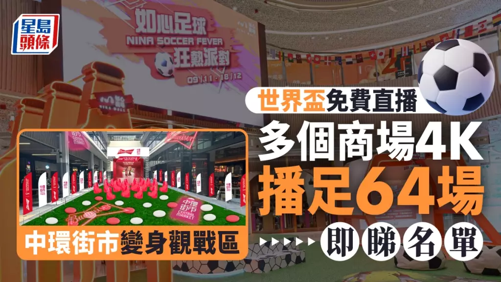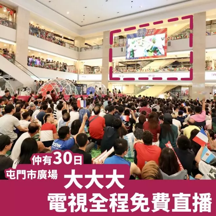 Now TV及Now E在港獨家直播全部64場世界盃賽事,免費電視ViuTV則只播放19場大賽,包括揭幕戰在內的13場分組賽,及兩場八強、兩場四強賽事、季軍爭奪戰及決賽。多個商場於是看準時機,在場內大搞世界盃狂熱直播,球迷免費欣賞足本賽事之餘,還可享受其他著數增值服務。下文詳列6大播足64場賽事商場的活動亮點: