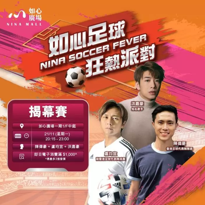 不少香港球迷熱捧的英格蘭國家隊將於11月21日對上伊朗隊。商場這天舉行狂熱VIP派對,除有專業評述員MC JIM作現場旁述,還有熱愛足球的歌手洪嘉豪,和前港足隊長陳偉豪及戰將盧均宜一同玩遊戲和表演。