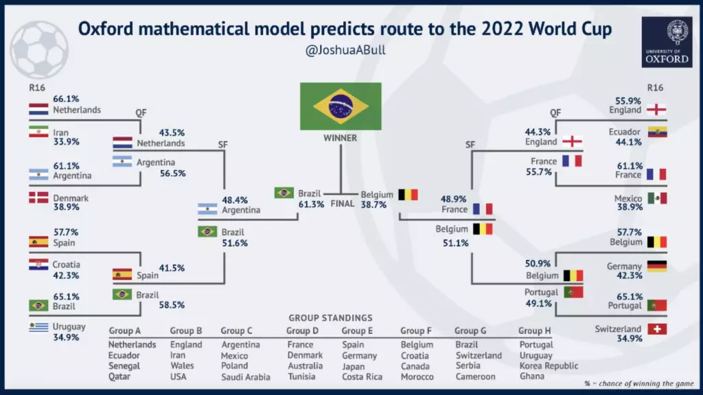 一項基於英國牛津大學開發的數學模型的研究預測,卡塔爾世界盃將由巴西封王,非洲、亞洲參賽球隊只得一隊伊朗能夠晉級十六強。