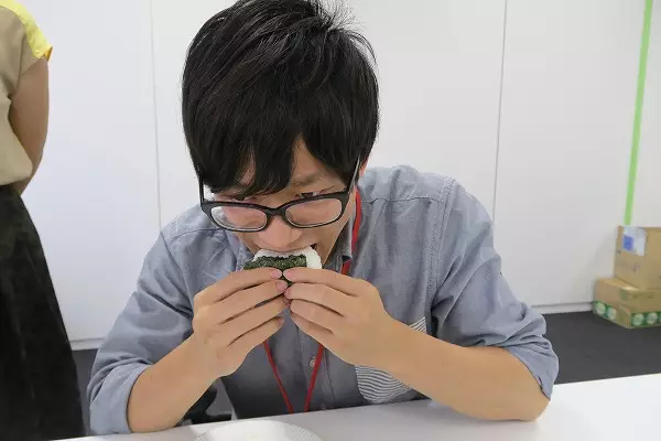 男同事試吃用手做飯糰後,直說「好好吃!美女搓的就是和別人不一樣」;不過到了試吃腋下飯糰時,他則高聲驚呼有一股香味飄來,根本就是「美味升天」,還誇張地說:「想拿去供奉起來。」
