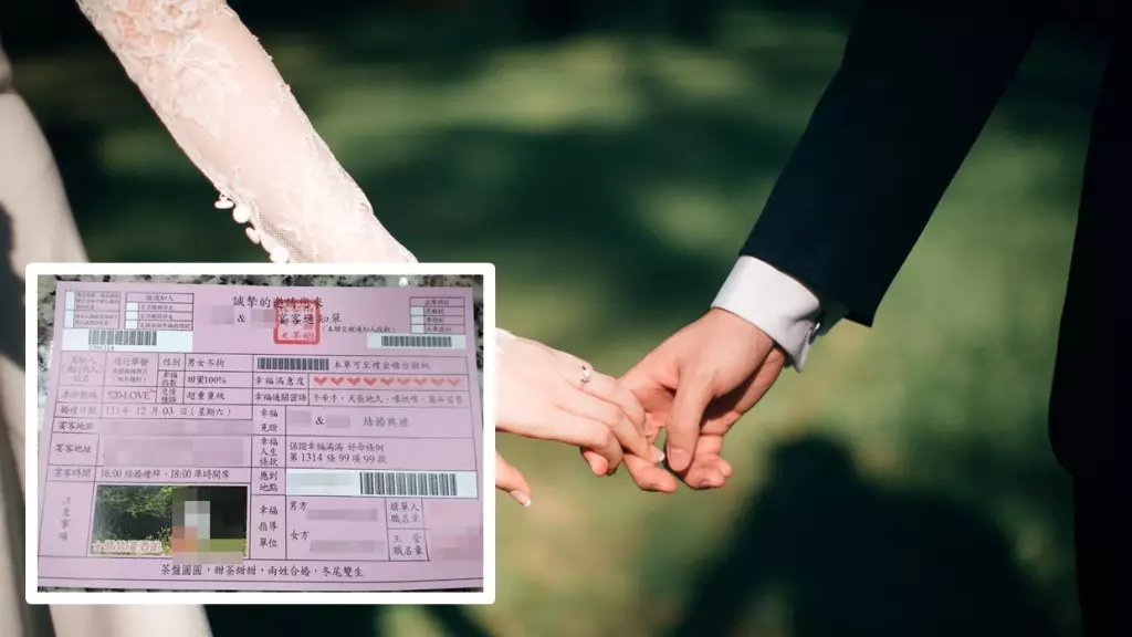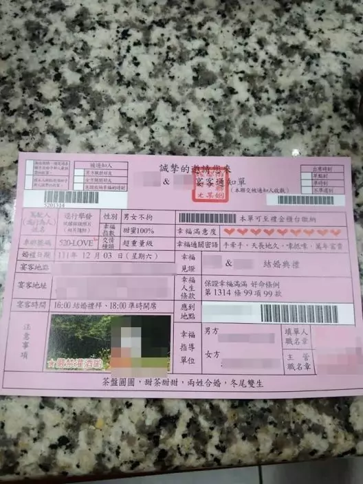在該張宴客通知單上,車牌號碼為「520-LOVE」,並寫上幸福滿意度等,在「幸福通關密語」中則列出「手牽手,天長地久」等,而原本「舉發違反法條」的一欄則變成「幸福人生條款」,並寫上「保證幸福滿滿,好命條例第1314條99項99款」,又寫上「本單可至禮金櫃台繳納」。