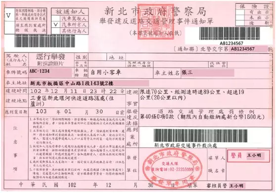 台灣違規通知單圖例。新北市政府交通事件裁決處網頁圖片