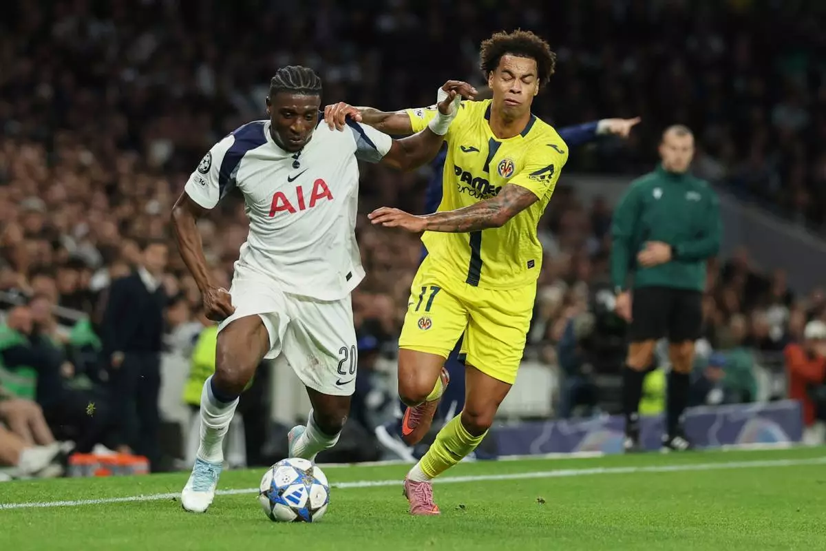 檔案圖片:2025年9月16日周二,熱刺球員穆罕默德古度斯(左)與維拉利爾(Villarreal)球員泰莊布坎南在倫敦舉行的歐聯足球賽中爭奪控球權。(美聯社圖片/Ian Walton) AP圖片