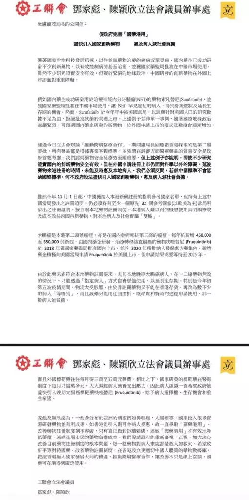 信中又說,由於此藥未能符合本地藥物註冊要求,尤其本地晚期大腸癌病人,在一二線藥物無效的情況下,只能透過「指定病人」方式自費恩恤使用,以延長生存期。特別是今年初第五波疫情期間,物流大受影響,由於非註冊藥物又不能在香港存貨,導致為數不少的病人「等唔到」,而且該藥只能用迂回曲折、既昂貴和費時的途徑申請使用,非一般病人能負擔。