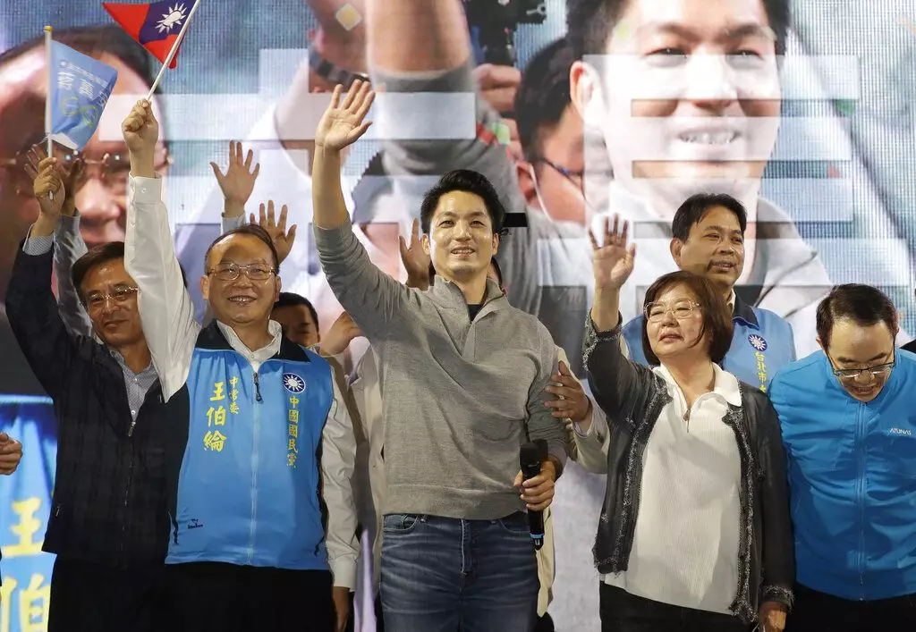 當選台北市市長的國民黨蔣萬安(前排中)與家人一同出席晚會謝票。