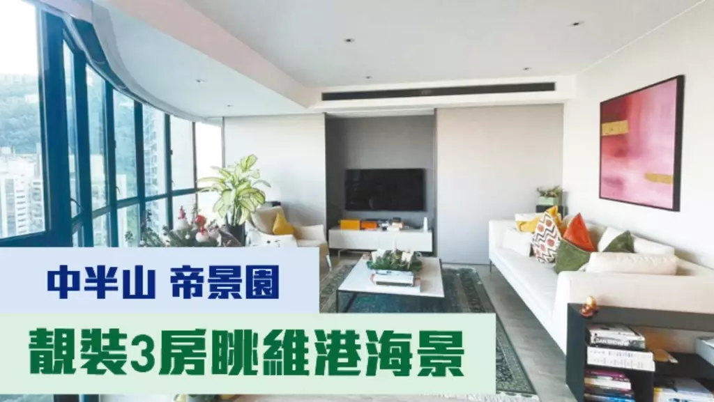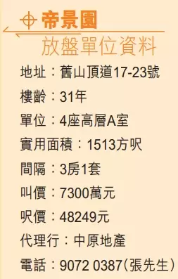 中半山豪宅帝景園,是區內著名豪宅。今日參觀屋苑4座高層A室,實用面積1513方呎,採用3房1套間隔,已有靚裝,俯瞰中區市景,遠眺維港海景,最新叫價7300萬元,實用呎價48249元。