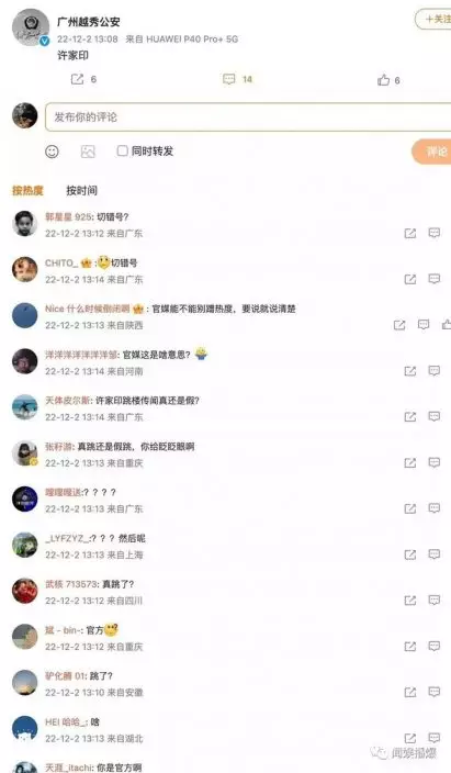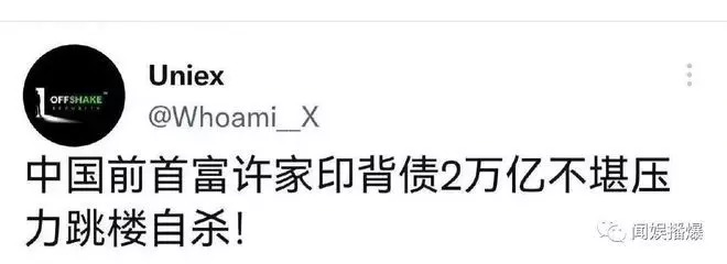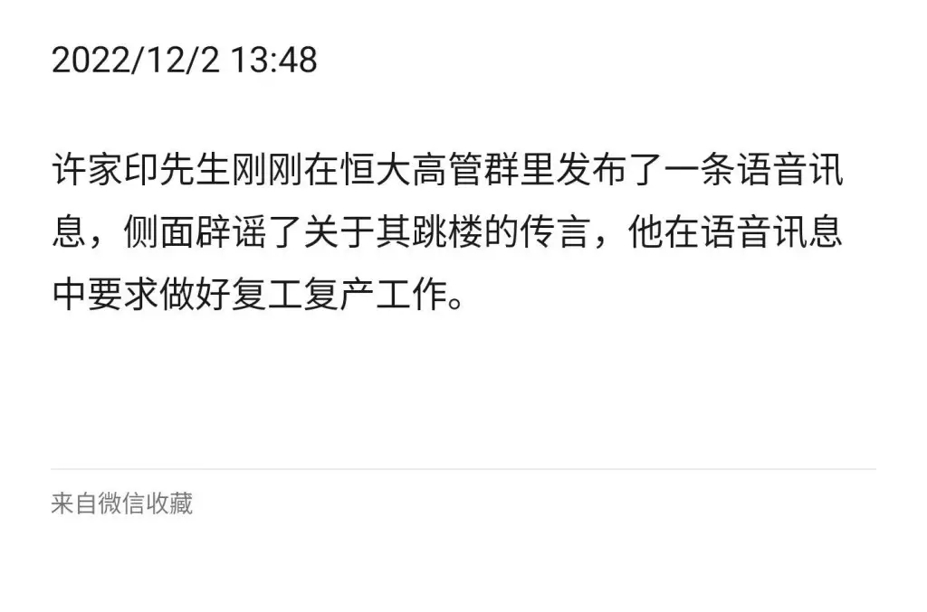 網傳中國前首富許家印背債2萬億不堪壓力跳樓自殺,引發關注,關於網上的傳聞,內媒引述恒大內部人士表示,「該消息是假的,傳言太可笑了。」此外,12月2日上午有恒大員工向許家印匯報了相關工作,且下午1時左右,許家印在恒大相關高層的聊天群組發佈了一條關於加強復工復產的語音消息,間接否認了網上的傳言。