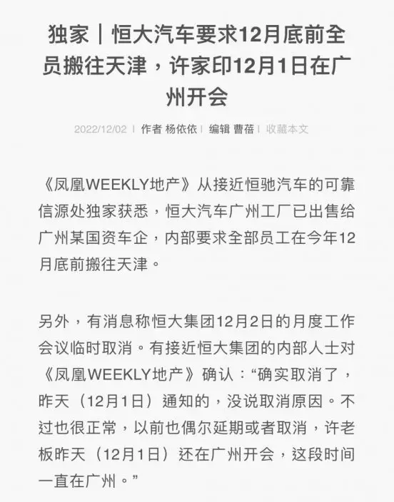 此外,《中國證券報》報道12月2日,有媒體消息稱,為降低成本,恒大汽車集團總部將解散,總部人員架構調整,大部分人面臨裁員,小部分人下沉到工廠。對此,接近恒大汽車的知情人士表示,消息不屬實。另外,有指恒大集團12月2日的月度工作會議臨時取消了,引發外界猜測,有恒大內部人士表示,會議取消也很正常,此前偶有發生。