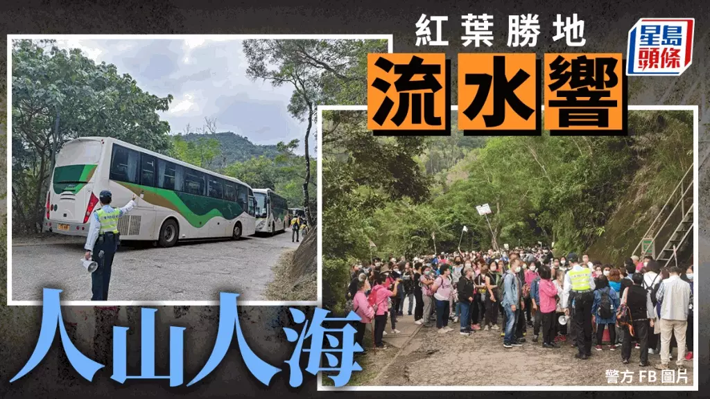 位於粉嶺的流水響水塘,因其猶如「天空之鏡」的水面而聞名,再加上近期入秋附近漸見紅葉,更令人們趨之若鶩。適逢12月4日秋高氣爽,在警方社交平台上載的相片可見,大批旅遊巴接載遊客到埗,流水響參觀遊客可謂是人山人海。