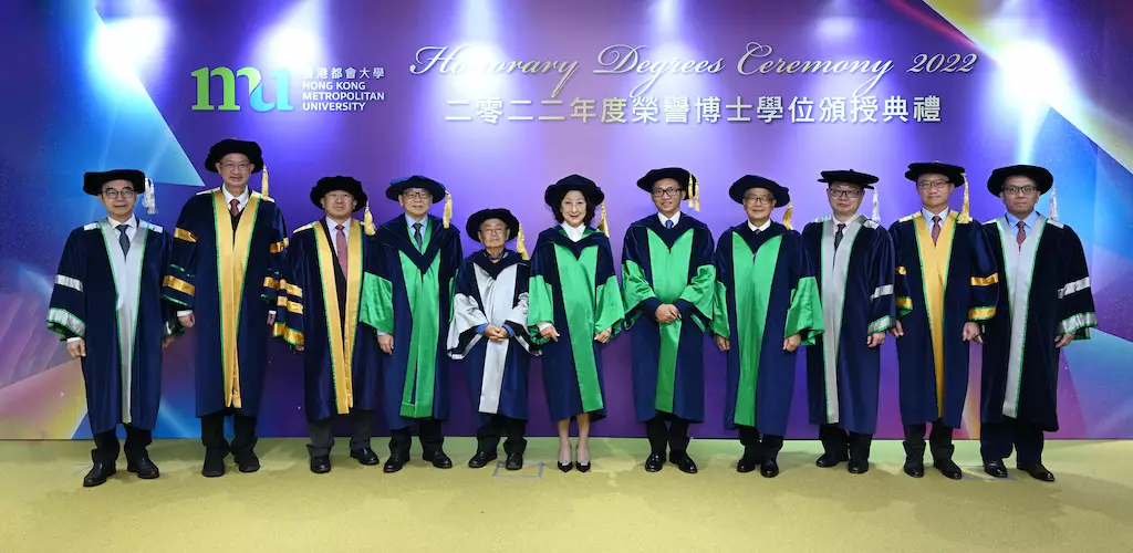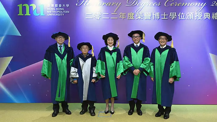 香港都會大學(都大)5日舉行2022年度榮譽博士學位頒授典禮,由校董會主席黃天祥頒授榮譽博士學位予五位傑出人士,分別為陳家駒、陳一丹、舒小佩、丁新豹及尹錦滔,以表揚他們的卓越成就。