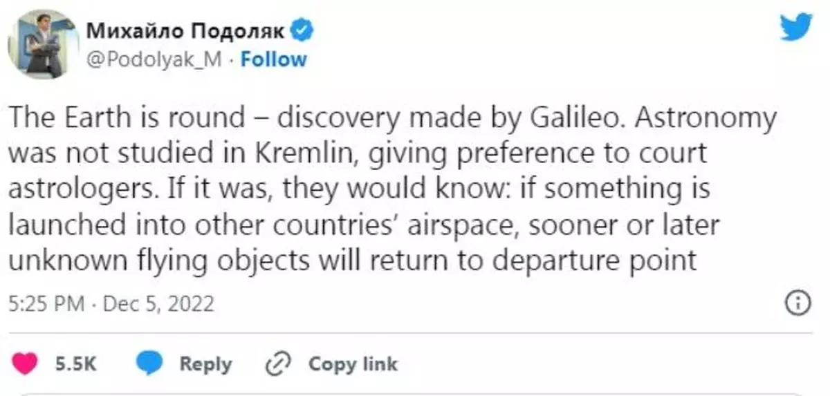 烏克蘭總統府顧問波多利雅科在推特發文,嘲諷事件。推特圖片。