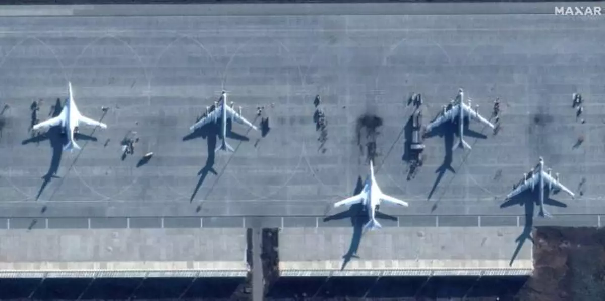 美國馬薩爾科技3日拍到的俄羅斯恩格斯(Engels-2)空軍基地衛星畫面,1架轟炸機準備起飛。網上圖片。