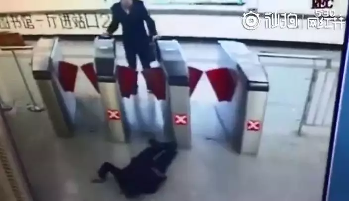 內地地鐵經常有人「逃票」,各部門嚴打亦沒甚麼成效。內地微博瘋傳一段片,終於見到有人「自作孽」,越閘失手趴低,血流一地。有網民謔道:「這傢伙人品不行,身手也不行。」