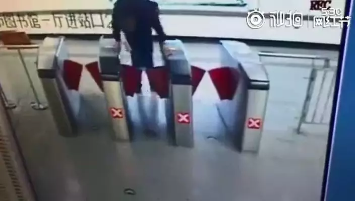 片段是西安地鐵二號綫市圖書館站閘機監控畫面。片中一名西裝友行到入閘機前,張望確認附近沒有人後,就以雙臂撑着閘口跳起跨越閘門,誰知重心不穩身體向前翻,臉部首先撞向地面。