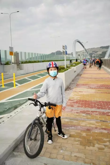 11歲姓院小朋友獨自踏單車到跨灣大橋,他指自己居於將軍澳廣場,過往在區內踏單車都「斷斷續續」,而跨大橋上單車徑則順通無阻。他大讚:「雖然好早起身嚟到,但見到(大橋)咁靚都值得,感覺好開心!」