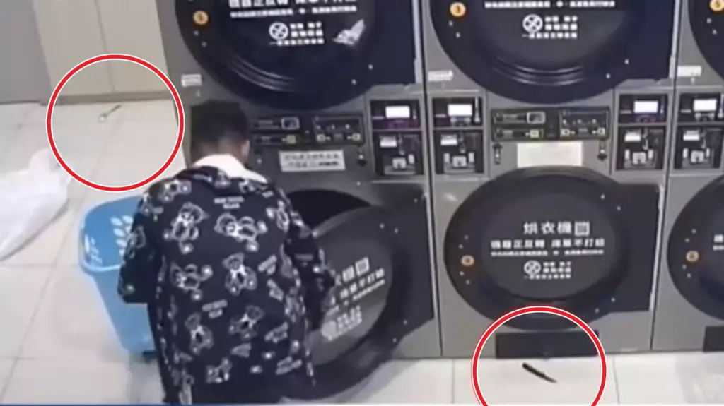 從店內的閉路電視可見,在凌晨兩時多,一名穿短褲的男子,悠悠哉哉從洗衣機裏把洗好的衣服拿出來,要換到乾衣機烘乾時,瞬間一支湯匙跌出地面,只見男子看了一眼後若無其事走向烘衣區,這時又有一支刀子掉出地面。