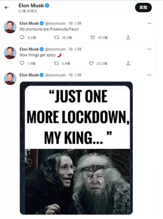 馬斯克還上傳一幅迷因圖(Meme),顯示福奇告訴美國總統拜登說:「再封鎖一次,我的國王……」。這顯然意指馬斯克再三抨擊、但已一年多不曾在美國實施的防疫措施。