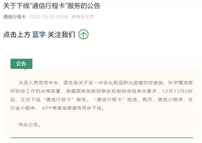 內地進一步放寬防疫措施,使用超過一千天的「通信行程卡」13日起全面下線不再使用,這個會顯示民眾過去14天(後縮短為7天)去過的所有地方、完整掌握出行軌跡的行程卡,即將成為歷史。相關用戶數據都會被徹底刪除,以杜絕數據安全風險。輿論借此回顧3年防疫,但意見分裂,有人說國家保護了3年,有人說浪費了3年。