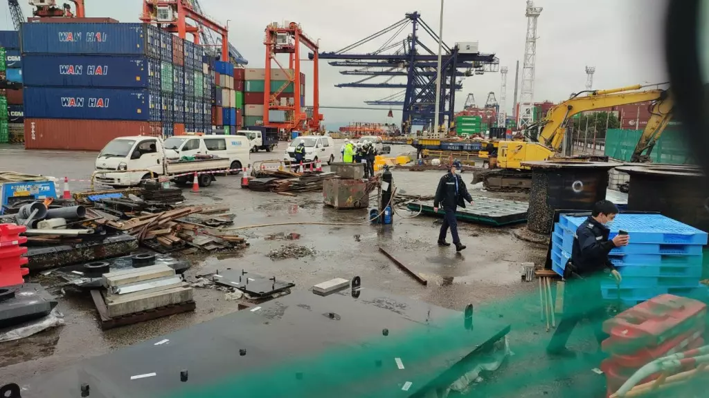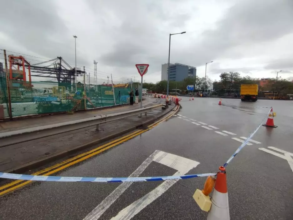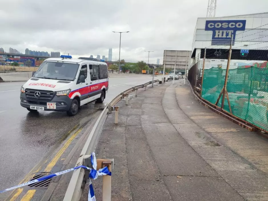 事主由鐵絲網內的8號貨櫃碼頭(圖左),飛彈到右邊的馬路行車線上。