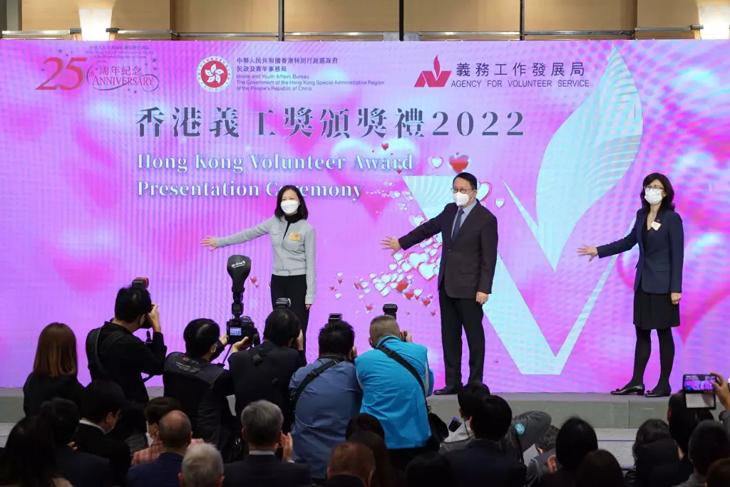 政務司司長陳國基、民政及青年事務局常任秘書長林雪麗、義務工作發展局主席彭韻僖律師,為「香港義工獎」舉行啟動禮儀式。
