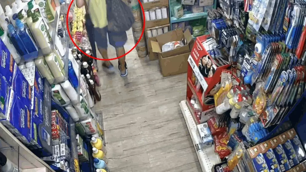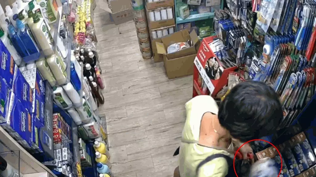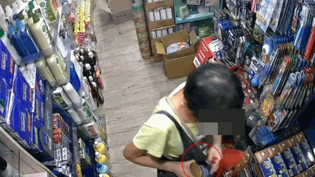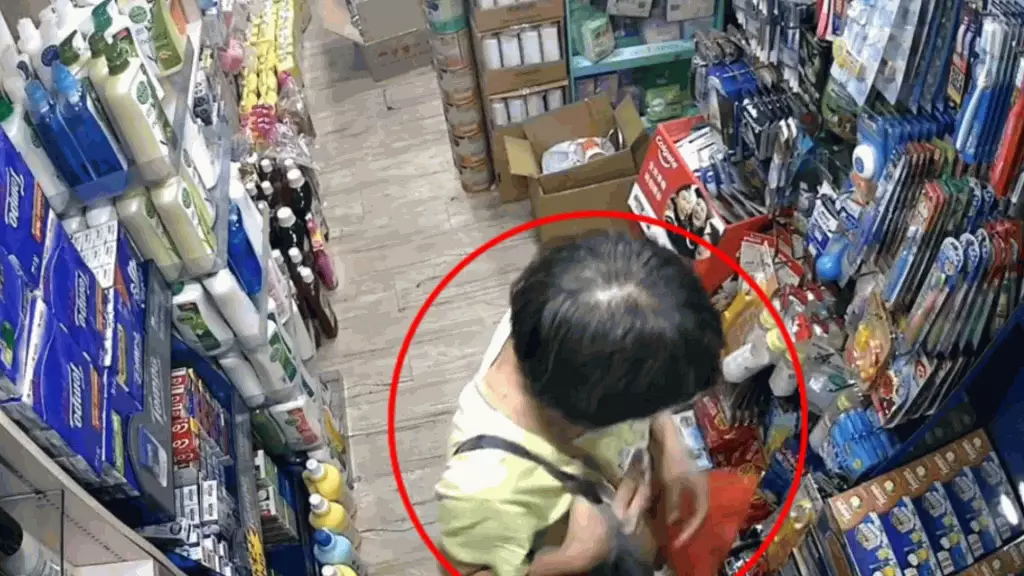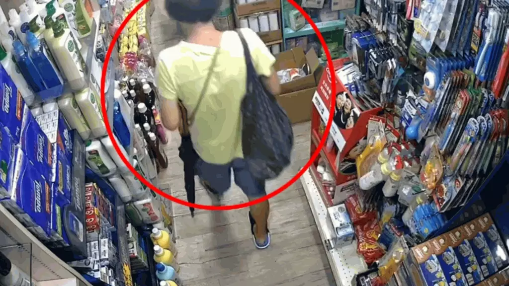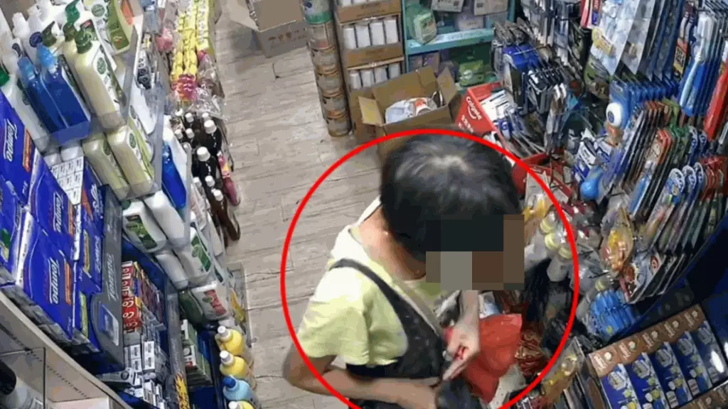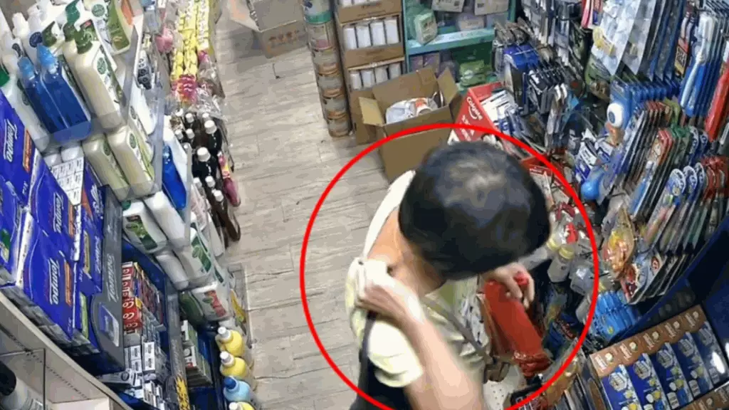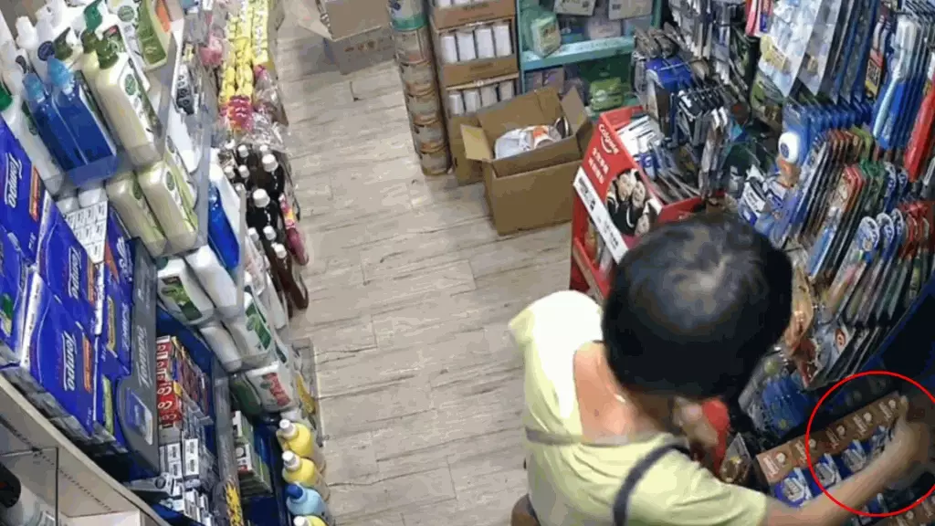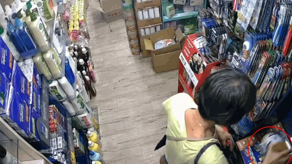 該影片全長約26秒,一名中年婦人在本港一間藥房偷偷將一罐奶粉放進斜孭袋中,然後施施然離開。