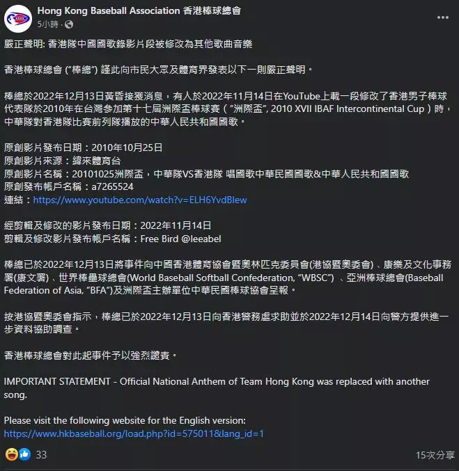 棒總表示,於周二(13日)黃昏接獲消息,指有人於今年11月14日,在YouTube上載一段修改了香港男子棒球代表隊,於2010年在台灣參加第17屆洲際盃棒球賽時,中華隊對香港隊比賽前列隊播放的中華人民共和國國歌。