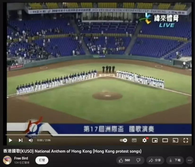 香港棒球總會15日向公眾及體育界發嚴正聲明,表示發現有網民將一場港隊比賽的奏國歌環節修改,由原本的《義勇軍進行曲》,改成其他歌曲。翻查網上片段,有關歌曲為一首與2019年「黑暴」浪潮和「港獨」示威有密切關連的歌曲。棒總強烈譴責事件,並就事件報警求助。