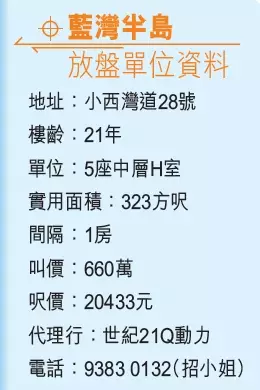 小西灣大型屋苑藍灣半島,坐落在小西灣海濱旁,擁有優越地理位置。今日介紹屋苑5座中層H室,實用面積323方呎,1房開則,裝修企理,家具齊全,外望海景,現叫價660萬,實用呎價約20433元。