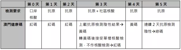 而入境後檢疫措施方面,中心表示,自入境翌日後連續3天,每天進行快速抗原檢測並將結果上載;入境翌日後,第3天上載快速抗原檢測陰性結果後,「澳門健康碼」將會轉為黃碼,當天應自行預約社區核酸站進行單樣核酸檢測,否則「澳門健康碼」會轉為紅碼;入境翌日後第4天及第5天,繼續每天進行快速抗原檢測,如續2天快速抗原檢測陰性後,「澳門健康碼」將轉為綠碼。