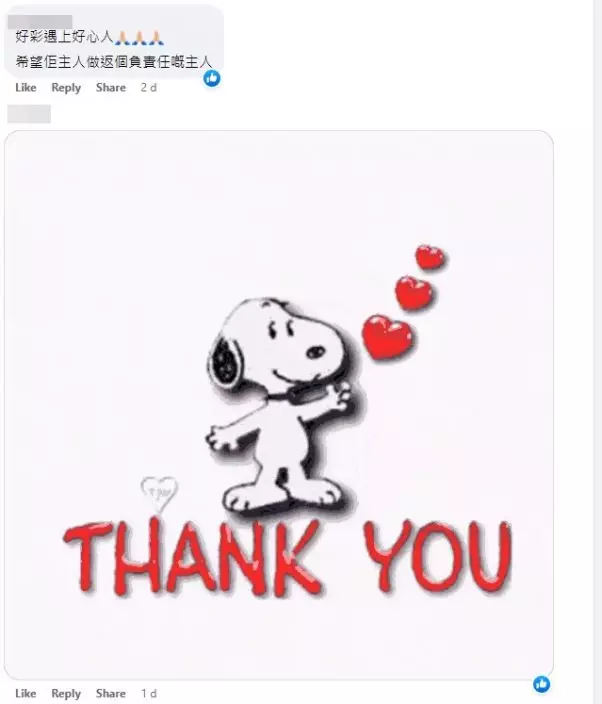 原來走失的狗狗叫「豆豆」,據知情網民指,「佢好似係元朗站下面村屋放養,識自己係元朗站返屋企」、「佢住喺元朗YOHO MALL對面條村,我上個禮拜喺YOHO MALL遇到佢第二次, 仲帶佢返屋企」。此外,網民亦「希望佢主人做返個負責任嘅主人」。